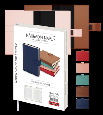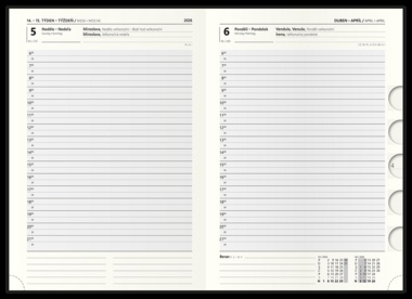 Náhradní náplň s výsekem pro luxusní denní diář. Velký prostor pro poznámky a plánování. náhradní náplň do diáře, šitá vazba V8, kapitálky, stužka, perforované rožky, ofset, 70g/m2, krémový papír, indexové výseky