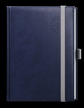 Denní diář v modré barvě z jemné vivelly ve formátu A5 s praktickou gumičkou a poutkem na propisku. Má velký prostor pro poznámky a plánování. jemný hladký materiál, ražba roku, jednostranná pěnová výplň desek, šitá vazba V8, stužka, kapitálky, perforované rožky, mapa ČR a SR, vlepená kapsa, gumička a poutkoofset, 70g/m2