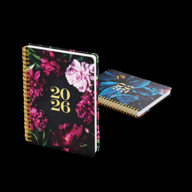 Denní diář v romantickém stylu ve spirálové vazbě a s trendy motivem na obalu. Módní doplněk s prostorem pro poznámky a plánování. Denní diář A5 Vám pomůže efektivně naplánovat každý den. oboustranná tištěná grafika potažená nepoškrabatelným matným laminem s parciálním lakem na přední straně, vazba twin wire, kulaté rožky ofset, 70g/m2