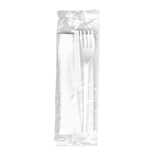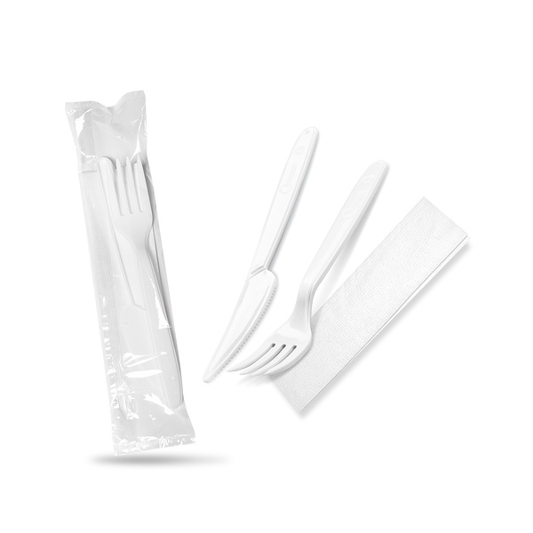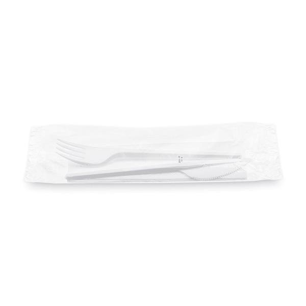 Hygienicky balená sada plastových příborů a ubrousku.