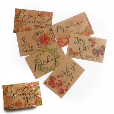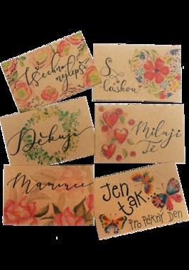 Sada malých děkovacích kartiček s originálním autorským obrázkem a volným polem pro dopsání libovolného textu. Skvěle poslouží k osobnímu poděkování, přání nebo krátkému vzkazu.
