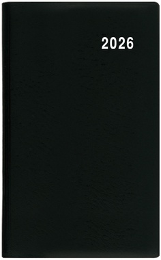 Jednoduchý a praktický měsíční diář vyrobený z jemného hladkého materiálu s polomatným povrchem černé barvy. Ideální pro každého, kdo si oblíbil měkkou šitou vazbu. jemný hladký materiál PVC, potisk roku bílou barvou, šitá vazba V1, ofset, 70g/m2