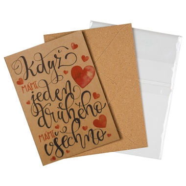 Láska se dá vyjádřit různými způsoby. Originální přáníčko pro ty, které chcete potěšit a pobavit. Grafika je ručně kreslená a psaná, proto mají BeBechy neomezené možnosti originálních motivů a textů. Přání je vyrobeno z recyklovaných materiálů. Kraft je odolný a uchovává si přirozenou barvu a texturu, která nám je velmi sympatická. Zároveň výroba tohoto papíru není nijak složitá, a tak minimálně zatěžuje životní prostředí. V ceně balení je recyklovatelná obálka a průsvitná fólie.