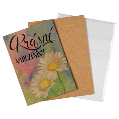 Balení obsahuje: přáníčko, recyklovatelnou obálku a průsvitnou fólii.