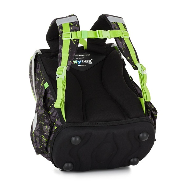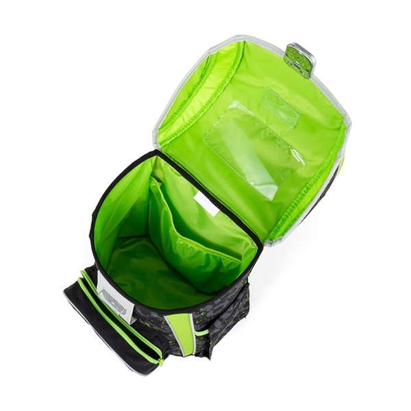 Egy tágas rekesz elegendő helyet kínál minden iskolai felszerelésnek. A masszív alj megvédi a tartalmat a felborulástól és a kiömléstől. A záródást egy biztonsági fém csat oldja meg, fényvisszaverő reflektorral. Az elülső zseb ideális uzsonnának, és **fényvisszaverő elemek** is találhatók rajta a gyermek jobb láthatósága érdekében.
