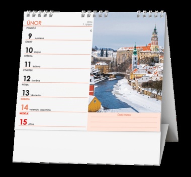 Ideální kalendář za ideální cenu s týdenním kalendáriem a v praktickém formátu s obrázky zajímavých míst v ČR. Papír: křída lesk, 100g/m2 Obálka: křída lesk 135 g/m2 Stojánek je z kvalitní bílé lepenky 600g/m2 Dělená kovová spirála "twin wire"