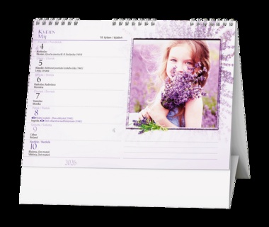 Stolní kalendář s týdenním kalendáriem a s levandulovým motivem. Papír: G print, 100 g/m2 Obálka: křída lesk 135 g/m2 Stojánek je z kvalitní bílé lepenky 600g/m2 Dělená kovová spirála "twin wire"