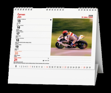 Stolní kalendář s týdenním kalendáriem pro milovníky rychlých motorek. Papír: G print, 100 g/m2 Obálka: křída lesk 135 g/m2 Stojánek je z kvalitní bílé lepenky 600g/m2 Dělená kovová spirála "twin wire"