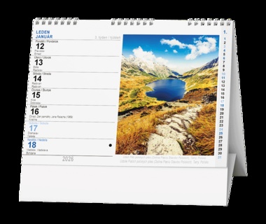 Stolní kalendář s týdenním kalendáriem s obrázky hor našich sousedů na Slovensku. Papír: G print, 100 g/m2 Obálka: křída lesk 135 g/m2 Stojánek je z kvalitní bílé lepenky 600g/m2 Dělená kovová spirála "twin wire"