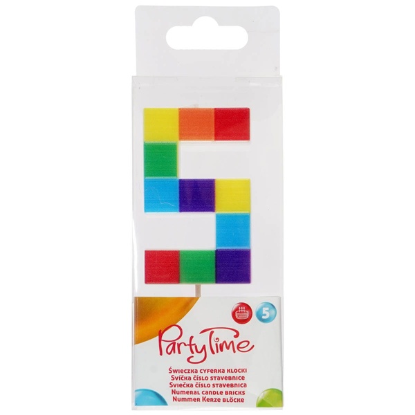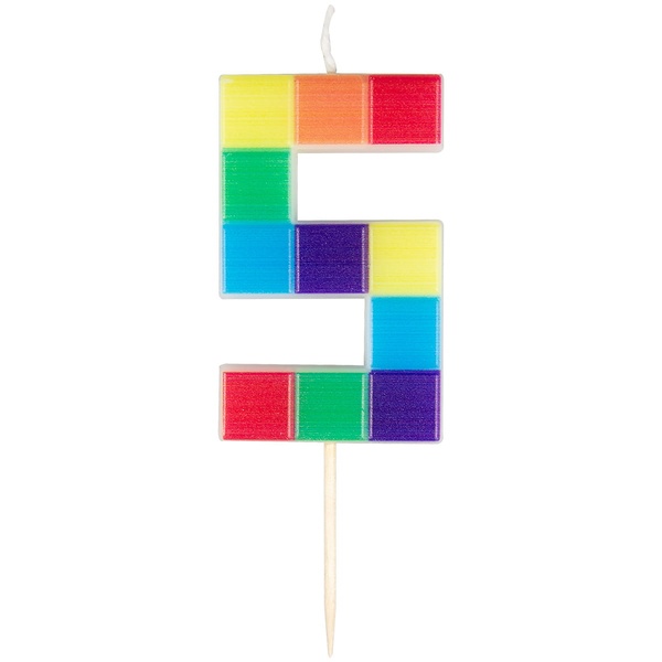 5-ös számú születésnapi tortagyertya építőkocka mintával látványos tortadísz gyerek születésnapi bulikra. A színes építőkocka minta vidám hangulatot kölcsönöz a tortának.
