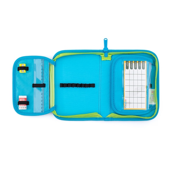 Egyszintes iskolai tolltartó 2 füllel, üres, 25 gumihurkot tartalmaz az írószer tárolására.