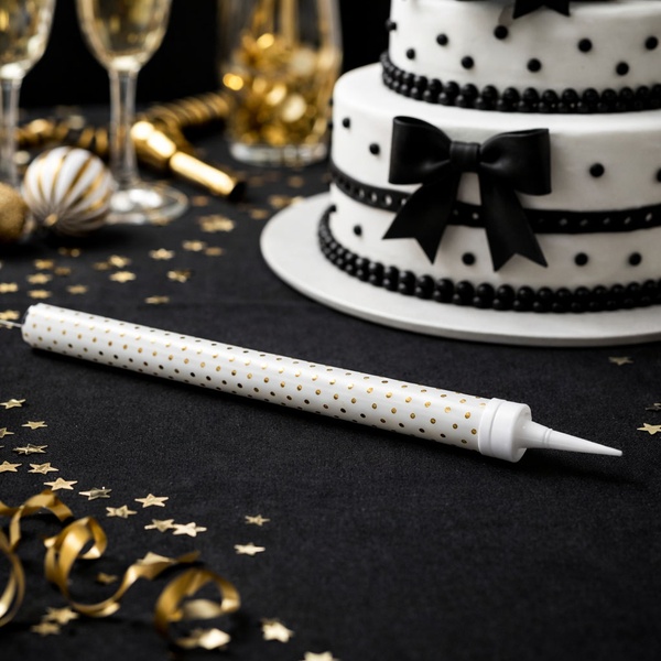 26 cm-es tortafontána arany pöttyös mintával látványos dekoráció születésnapi tortákhoz, desszertekhez és ünnepi alkalmakhoz. Meggyújtás után csillogó szikraeffektet hoz létre, amely különleges hangulatot ad az ünneplésnek.