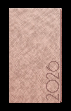 Kapesní týdenní diář v pudrové barvě se strukturovaným povrchem. Moderní doplněk do každé kapsy. Diář má velký prostor pro poznámky a plánování. strukturovaný materiál s lesklým povrchem, ražba roku, šitá vazba V8, stužka, perforované rožky, ofset, 70g/m2