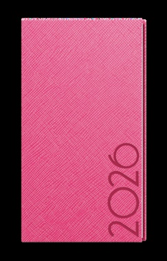 Kapesní týdenní diář v růžové barvě se strukturovaným povrchem. Moderní doplněk do každé kapsy. Diář má velký prostor pro poznámky a plánování. strukturovaný materiál s lesklým povrchem, ražba roku, šitá vazba V8, stužka, perforované rožky, ofset, 70g/m2