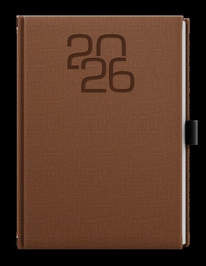 Týdenní diář hnědé barvy formátu A5 vyrobený ze zajímavého materiálu s moderní ražbou roku a poutkem na tužku. strukturovaný materiál, ražba roku, jednostranná pěnová výplň desek, šitá vazba V8, poutko na tužku, stužka, kapitálky, perforované rožky, mapa ČR a SR, vlepená kapsa, ofset, 70g/m2