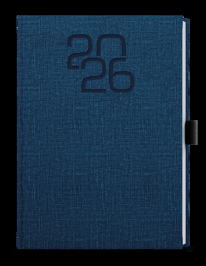 Týdenní diář modré barvy formátu A5 vyrobený ze zajímavého materiálu s moderní ražbou roku a poutkem na tužku. strukturovaný materiál, ražba roku, jednostranná pěnová výplň desek, šitá vazba V8, poutko na tužku, stužka, kapitálky, perforované rožky, mapa ČR a SR, vlepená kapsa, ofset, 70g/m2