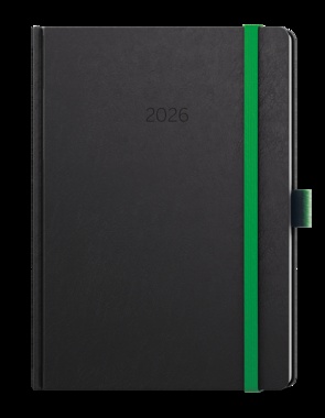 Neobyčejný týdenní diář s matným povrchem ze strukturovaného materiálu se zelenou gumičkou a poutkem. Je vyráběný ve formátu A5, má velký prostor pro poznámky …