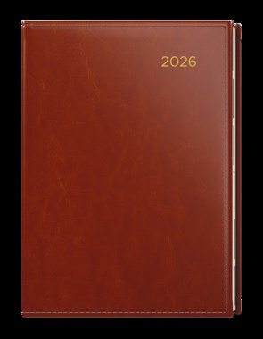 Týdenní diář vyrobený z hnědé koženky s moderní zlatou ražbou roku. Diář, který povýší jakoukoli Vaši schůzku. jemný hladký materiál s lesklým povrchem, ražba roku, obšití v béžové barvě, jednostranná pěnová výplň desek, šitá vazba V8, kapitálky, stužka, perforované rožky, ofset, 70g/m2, krémový papír