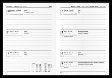 Týdenní diář v černé barvě se strukturovaným povrchem. Moderní doplněk v oblíbeném formátu. Diář má velký prostor pro poznámky a plánování. strukturovaný materiál s lesklým povrchem, ražba roku, jednostranná pěnová výplň desek, šitá vazba V8, stužka, perforované rožky, vlepená kapsa, ofset, 70g/m2