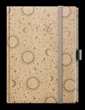 Týdenní diář v oblíbené vivelle s béžovou celoražbou s motivem Hvězd. Diář v oblíbeném formátu s velkým prostorem pro poznámky a plánování. jemný hladký materiál, celoplošná ražba motivu včetně ražby roku, šitá vazba V8, stužka, gumička, poutko na propisku, perforované rožky, vlepená kapsa, ofset, 70g/m2